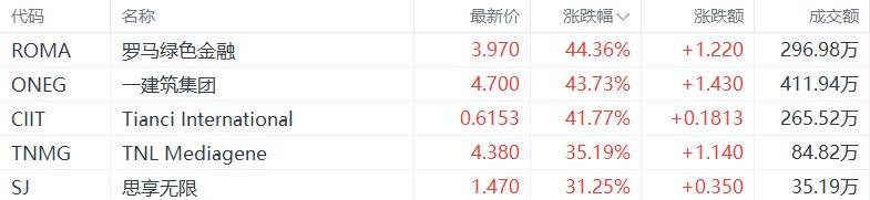 中概股收盘涨幅居前的个股为:罗马绿色金融涨44.36%,一建筑集团涨43.73% ,Tianci International涨41.77%,TNL Mediagene涨35.19%,思享无限涨31.25% 。(格隆汇)